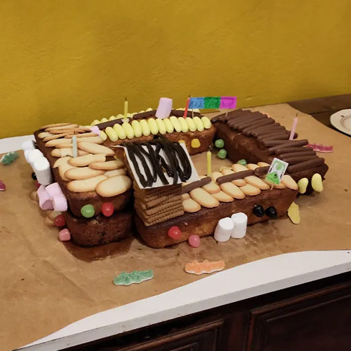 Mais n’allez pas cantonner Fanny aux cases de gestion et de littéraire ! Car ses petites attentions pour divers événements montrent qu’elle est avant tout une artiste ! Et si vous en doutez, voici un exemple de ce qu’elle peut confectionner, ici pour les 5 ans de l’écolieu avec l’aide des jeunes magnyeth' : une maquette gourmande du “château de Magny” !